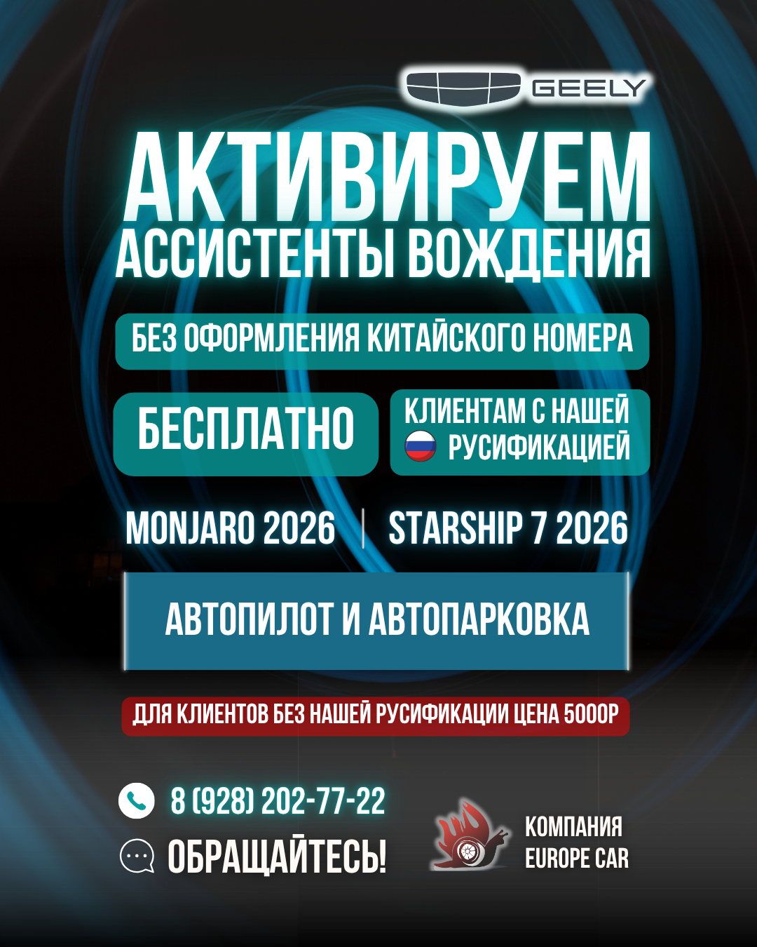 Сделаем активацию помощников вождения на Вашем Starship 7/Monjaro 2026 модельного года. Вам станут доступны автопарковка и автопилот (интеллектуальный круиз контроль). Активируем ассистентов БЕЗ оформления китайского номера, поэтому Вам не нужно будет каждый год оплачивать китайскую сим карту.